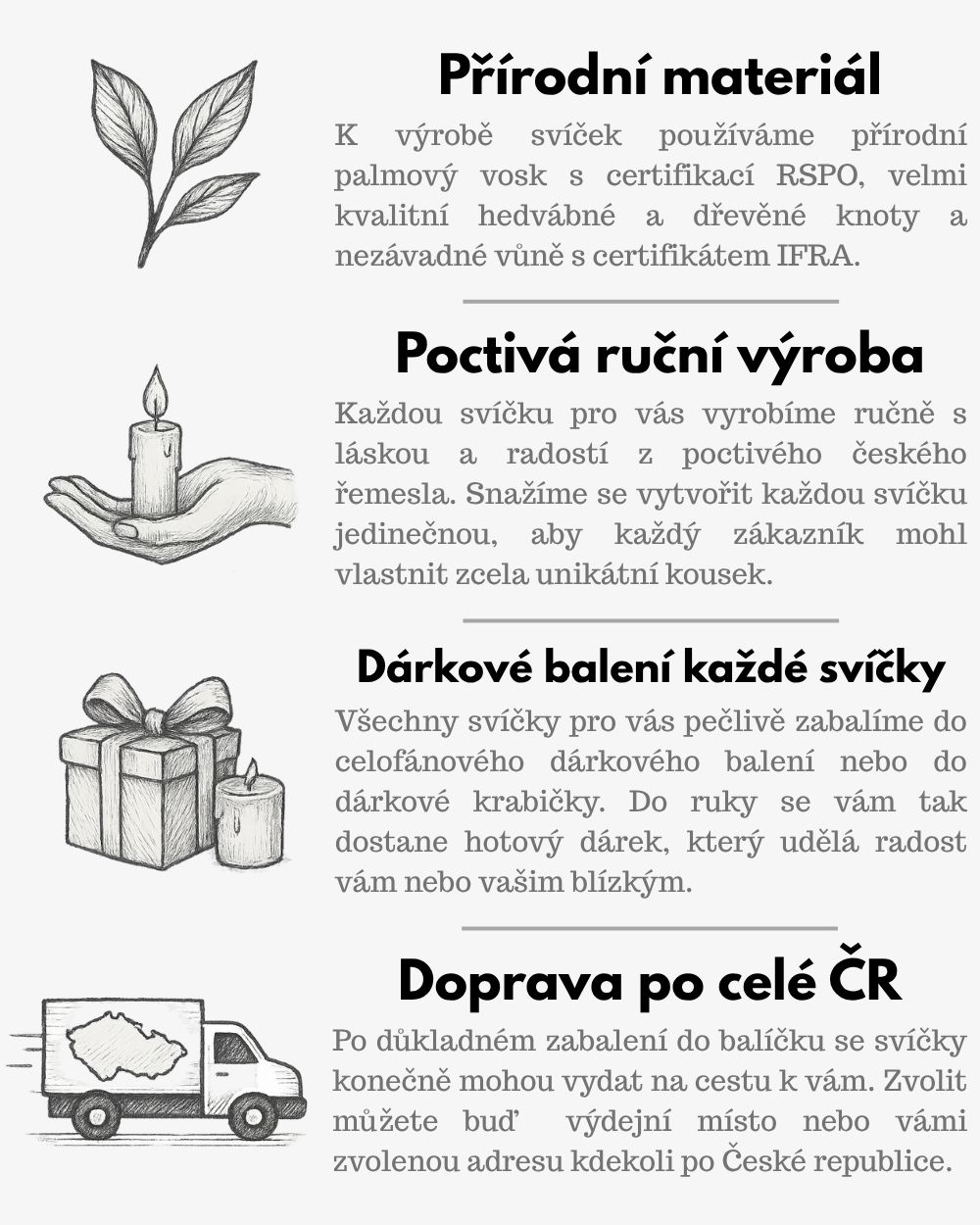 Jsme malá rodinná firma a výrobou svíček se zabýváme již řadu let. Všechny svíčky vyrábíme výhradně ručně, bez pomoci jakýchkoli továrních strojů. Každá svíčka je tedy unikát a nikdy nenajdete dvě úplně stejné. I přes tento individuální přístup je naší hlavní prioritou udržet vždy stanovený vysoký standart a každou svíčku odevzdat zákazníkovi v její dokonalé formě. Snažíme se pomocí vosku tvořit více než jen svíčky. Naším cílem je pozvednout svíčkařství na umělecký obor a s láskou vytvářet svíčky, které pod našima rukama získají vlastní duši a vzniknou z nich předměty skutečné umělecké hodnoty. Každá svíčka je díky naší ruční výrobě jedinečná a spolu s ní tedy zákazníkovi vždy odevzdáváme i část sebe sama a to nás na naší práci nejvíce těší! Více o našich svíčkách zde.